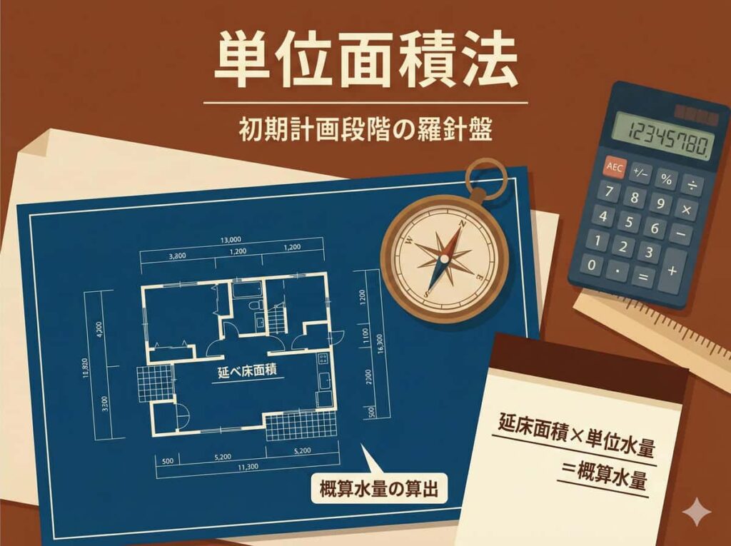 まだ具体的な間取りや人員配置が決まっていない「基本計画」の初期段階では、延べ床面積から概算水量を算出する「単位面積法」が重宝されます。